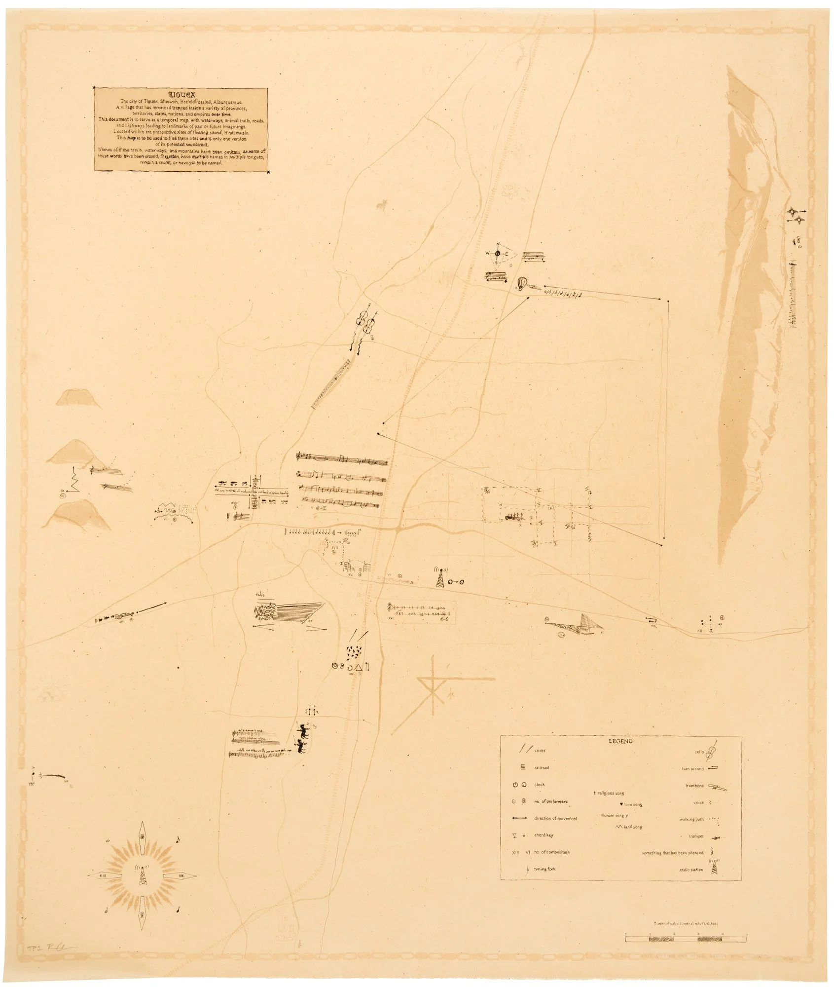 The score shows the geographic locations of where the movements will take place throughout the city, while also functioning as a temporal map, referencing the diverse landscapes of the central Rio Grande valley: